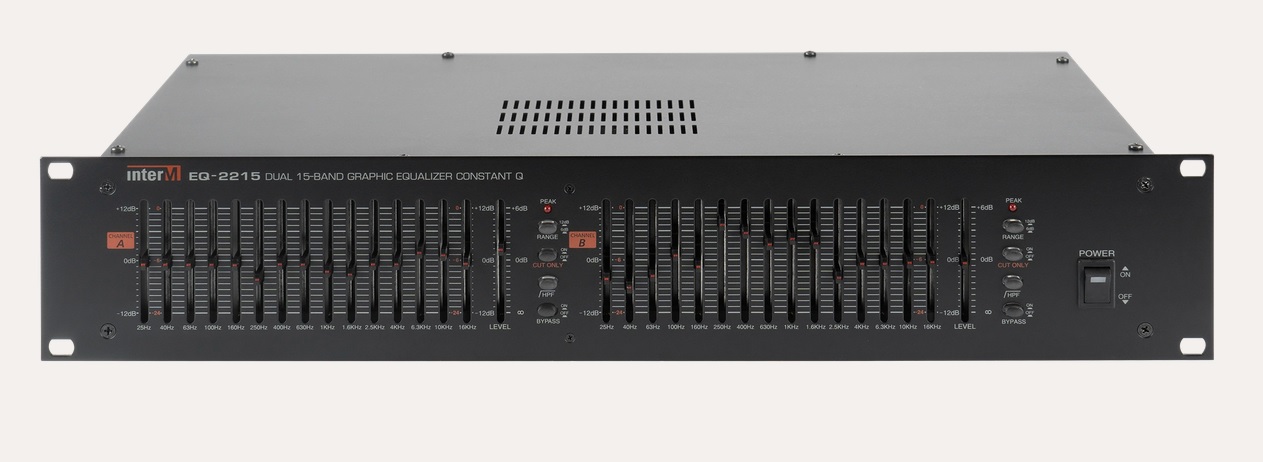 Эквалайзер EQ-2215 имеет 2 независимых канала, в каждом из которых предусмотрено 15 полос для регулировки амплитудно-частотной характеристики. Выбор центральных частот для полосовых фильтров соответствует международным стандартам, соседние частоты отличаются на 2/3 октавы. В каждом из каналов входной сигнал разбивается полосовыми фильтрами на 15 составляющих. Пользователь может для каждой составляющей аудио сигналов с помощью регуляторов установить собственный коэффициент ослабления или усиления. Регуляторы выполнены в виде вертикальных 'слайдеров', которые перемещаются в пределах 45 мм. Такая глубина перемещения обеспечивает удобство и точность работы с эквалайзером. Диапазон регулировки может быть выбрана пользователем и составляет 12 или 24 дБ.