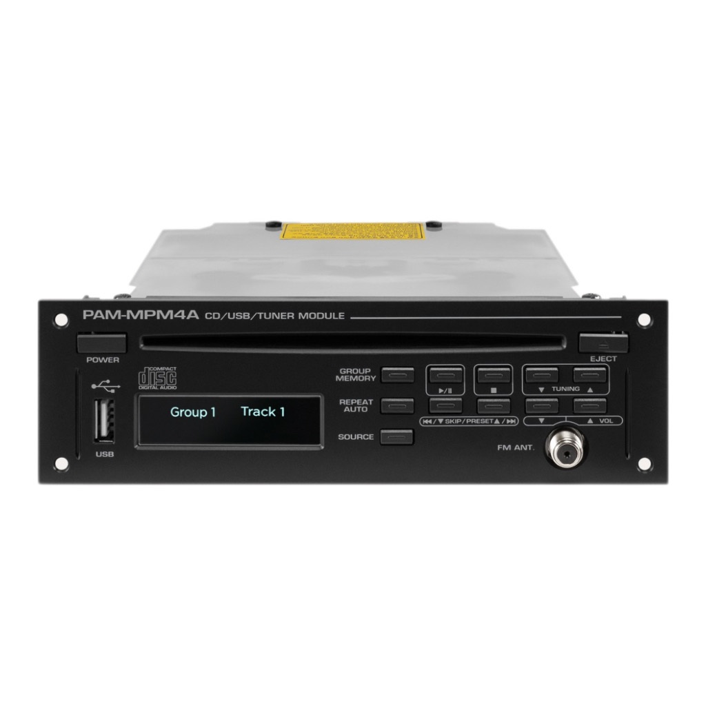 Устройство включает в себя однодисковый CD-проигрыватель, USB-порт для воспроизведения аудиофайлов MP3, WMA и WAV с USB-накопителей, а также цифровой FM-тюнер. В комплекте поставляется антенна, предназначенная для подключения к соответствующему входу на фронтальной панели. PAM-MPM4A обладает функцией сохранения настроек для сорока FM-радиостанций в диапазоне частот 87,5-108,0 МГц, используя для этого энергонезависимую память. Для визуализации текущего режима работы предусмотрен жидкокристаллический дисплей с подсветкой. При воспроизведении файлов доступны опции повтора трека или воспроизведения в случайном порядке.